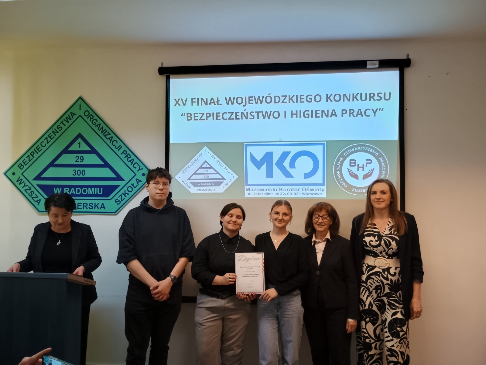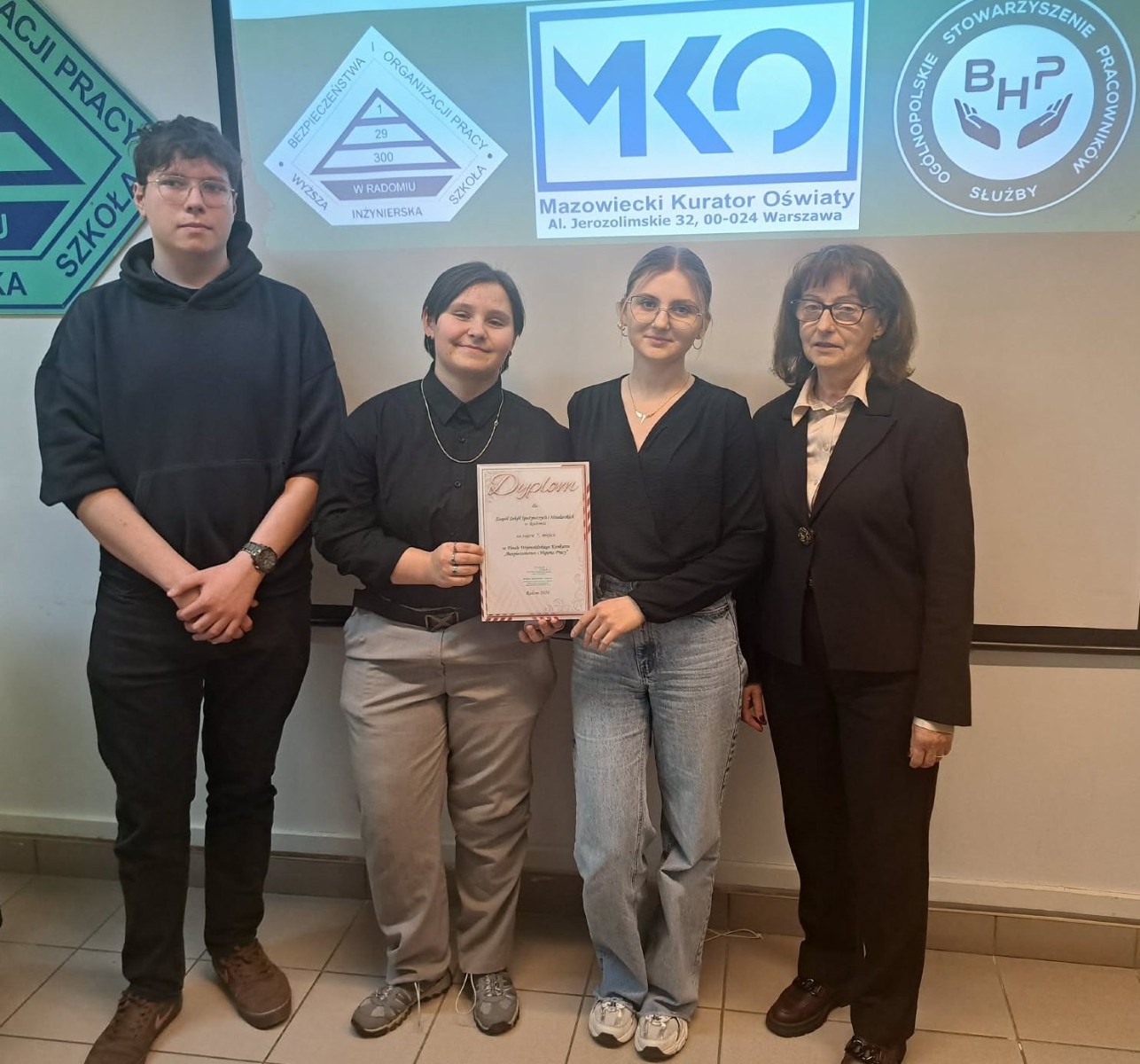 Uczniowie klasy 4gb wzięli udział w finale konkursu "Bezpieczeństwo i higiena pracy" organizowanym przez Wyższą Inżynierską Szkołę Bezpieczeństwa I Organizacji Pracy w Radomiu zajmując 4 miejsce.