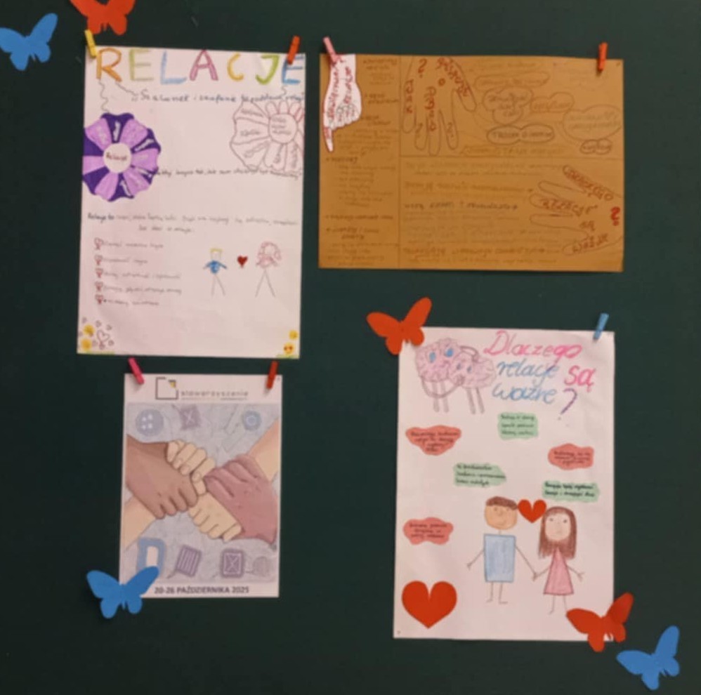 W bibliotece szkolnej można było poczytać książki o relacjach oraz wziąć udział w akcji Przerwa na relacje i zagrać w gry planszowe. Uczniowie mieli też możliwość uczestnictwa w Relacyjnym totolotku i wylosować osobę, z którą mieli spędzić przerwę. Była to okazja do bliższego poznania koleżanki lub kolegi. Uwieńczeniem działań było nagranie przez uczniów i nauczycieli słuchowiska Nikt nie jest samotną wyspą. Było ono oparte na wynikach anonimowej ankiety, przeprowadzonej wśród członków naszej szkolnej społeczności. Podcastu słuchaliśmy wszyscy podczas długiej przerwy.