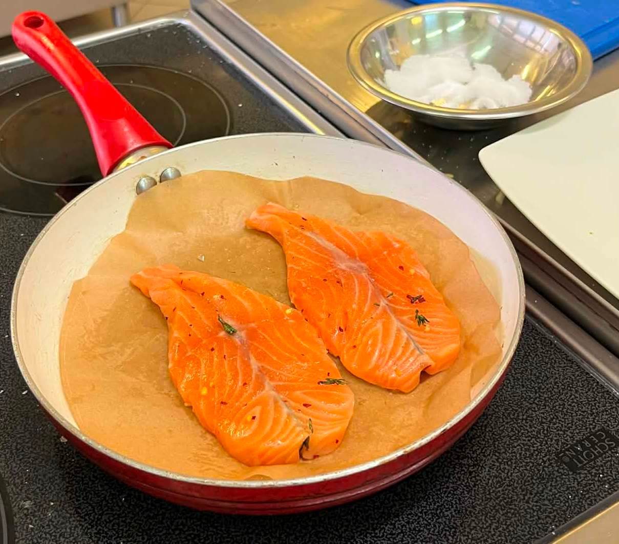 Mateusz przygotował roladki z łososia w nori z sosem jagodowo-miętowym z kawiorem molekularnym oraz serkiem śmietankowym i chipsem z parmezanu oraz kotlety rybne z boczkiem z sosem pomarańczowo - tymiankowym z ryżem ala risotto z chipsem z boczku, ze skóry ryby oraz limonki i z sałatką w fenkułem włoskim z marchwi groszku i orzechów laskowych.